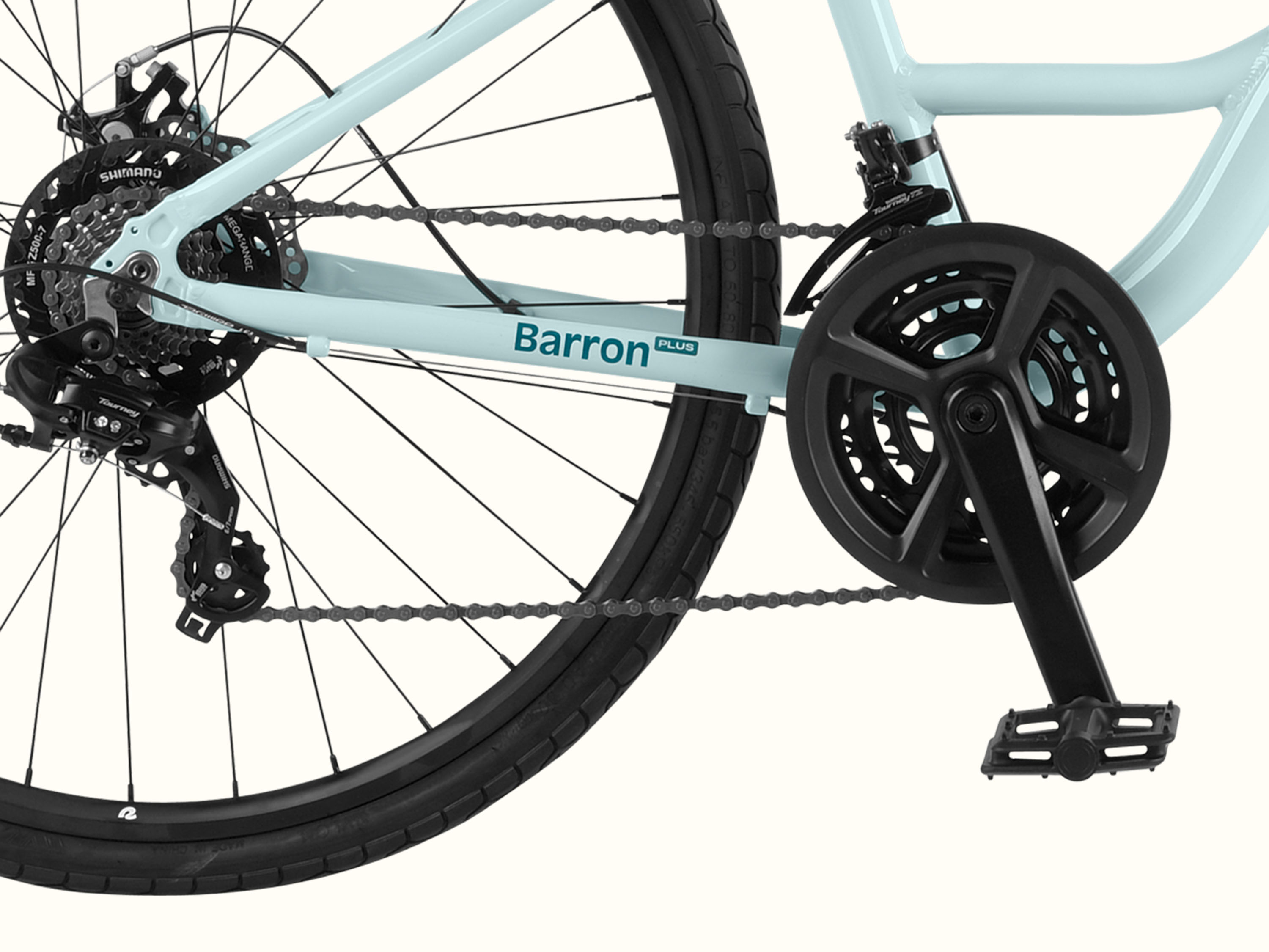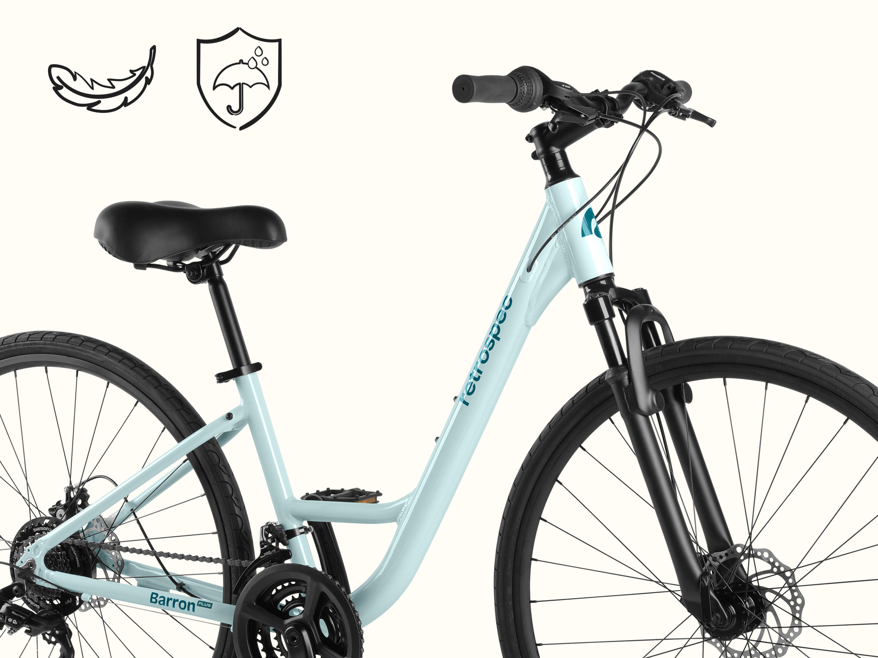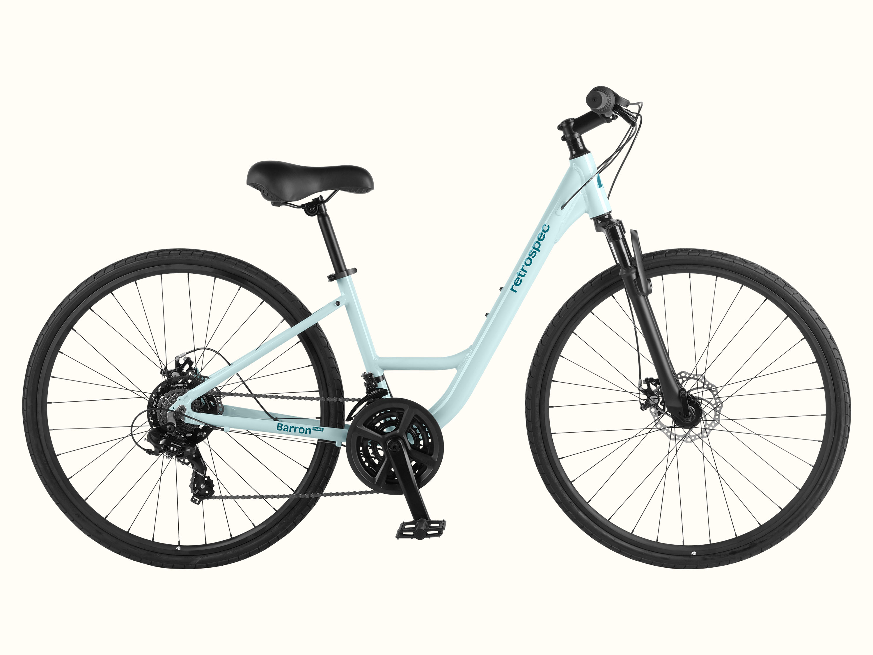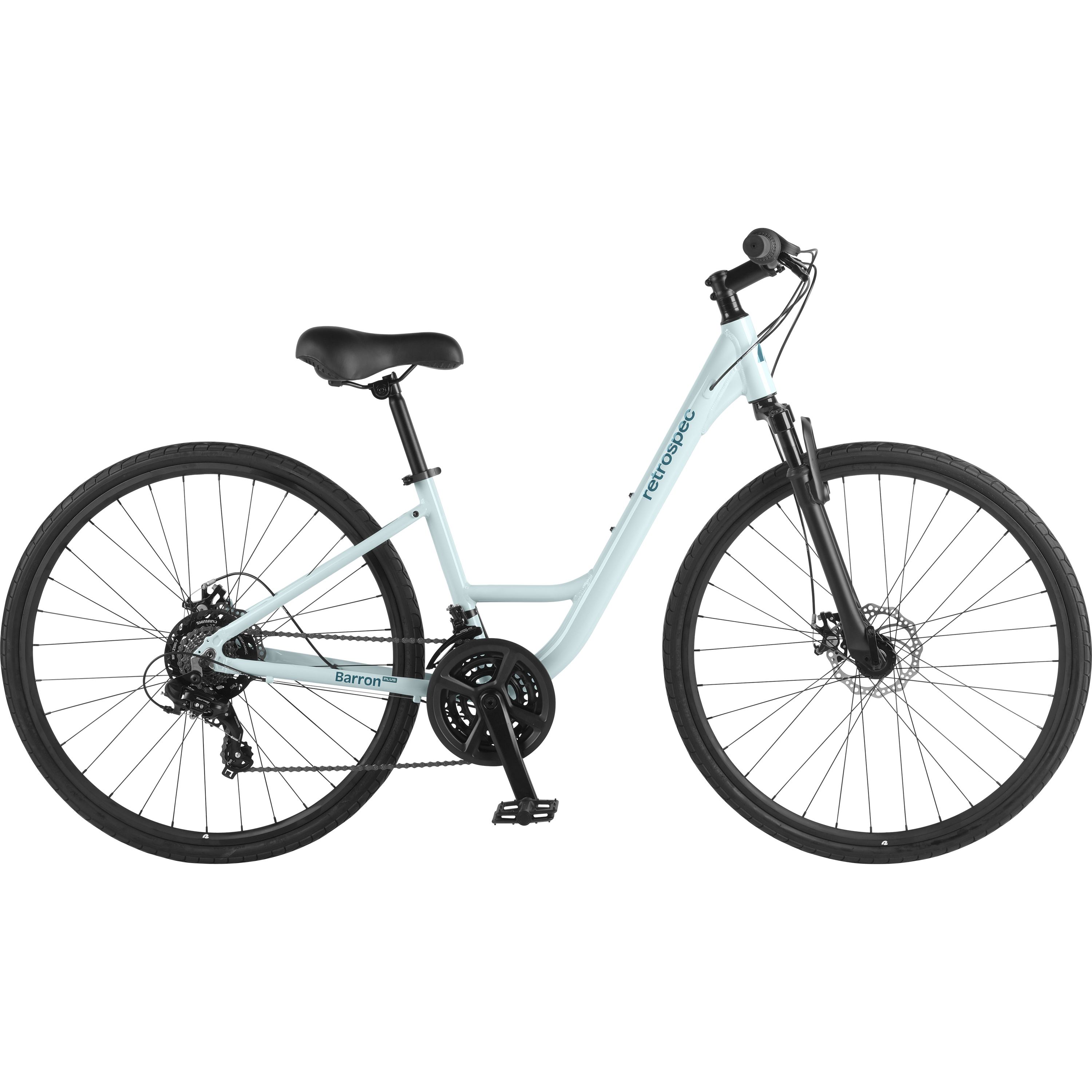 If comfort and performance had a baby, they would name it Barron Plus. This premium comfort hybrid bike effortlessly fuses features that make your ride comfortable with features that make it powerful. Hop on and off with ease thanks to a low-to-the-ground and extra-wide step through frame design that makes the bike more accessible, and sit comfortably with a padded saddle and upright riding position. With an aluminum frame and components, this bike is lightweight, nimble, and easier to handle, and it’s outfitted with mounting points all around the bike to add a rear rack, fenders, and other accessories to customize your ride. A versatile 21-speed drivetrain can handle steep hills, flat roads, and anything in between – perfect for riding in areas with varied inclines – and grooved hybrid tires and a shock-absorbing front suspension fork mellow out unevenness in the road for a smooth ride, every time.